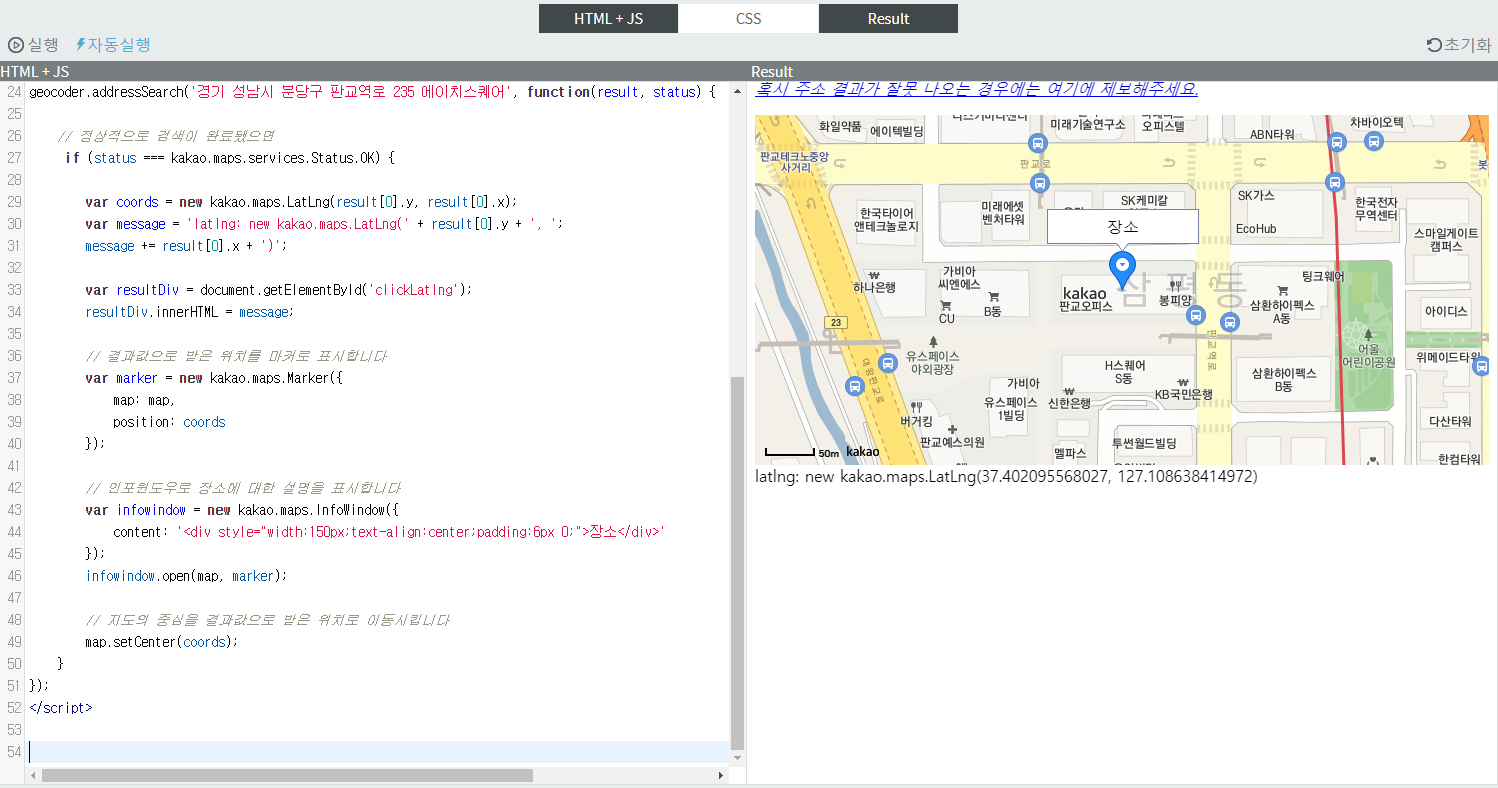 중간의 주소 부분 ('경기 성남시 분당구 판교역로 235 에이치스퀘어') 을 변경하시면 위도, 경도가 나옵니다.