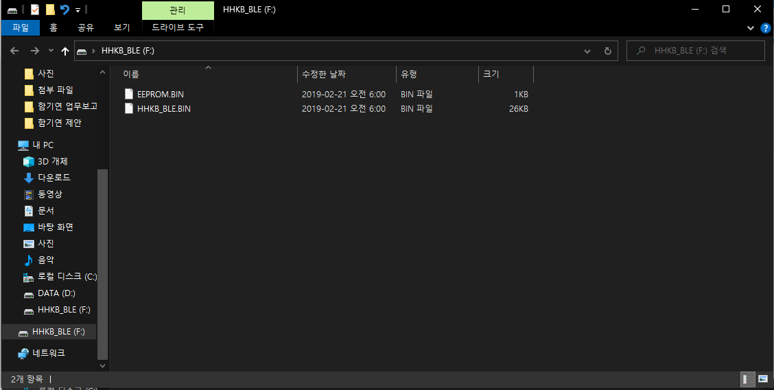 화일 탐색기에서 HHKB_BLE 드라이브 루트에 다운 받은 화일을 덮어씁니다.