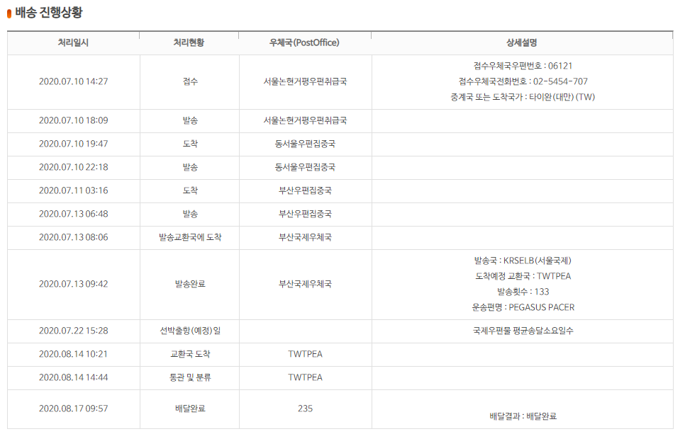 오늘 확인해 보니 도착했네요. 발송에서 부터 대략 40일정도 소요되는 것 같습니다.