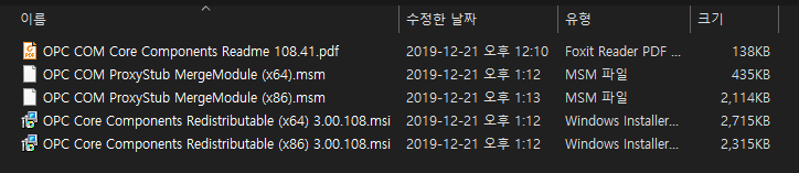 압축화일(opc-core-components-redistributables-3.00.108-20191220.zip)을 받아서 압축을 풀면 다음과 같은 화일들이 나옵니다.