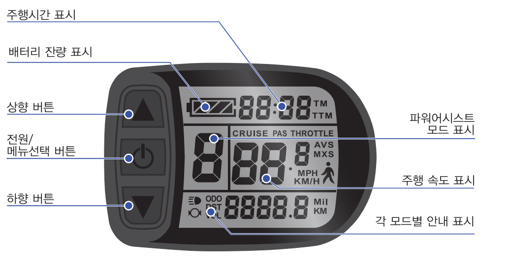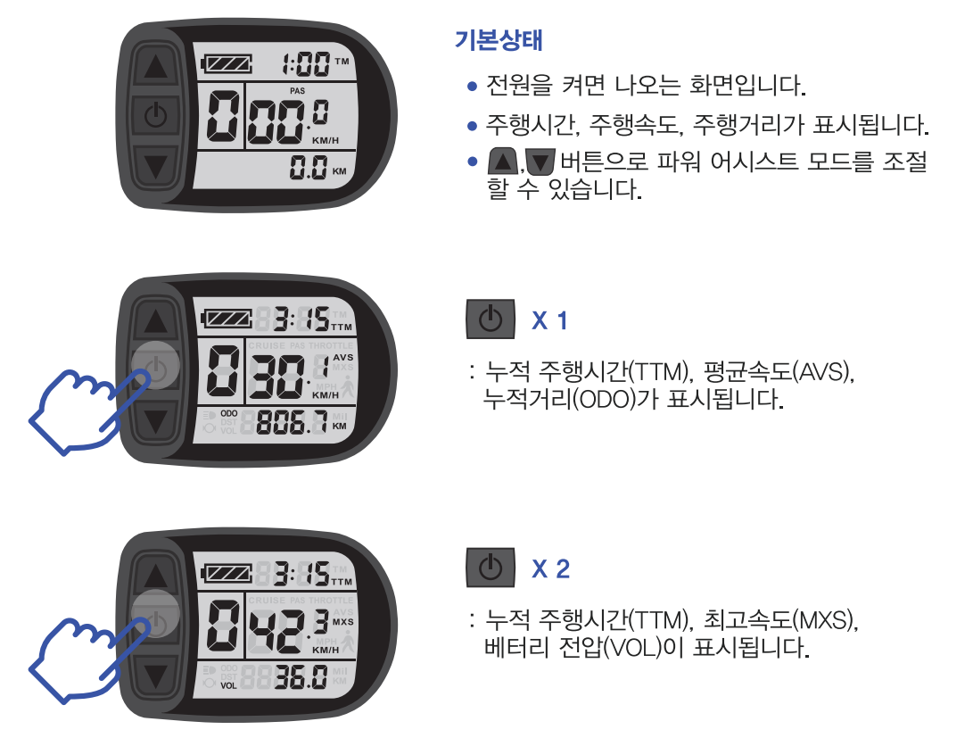 8. 주행시간, 주행거리 초기화 - 켜진 상태에서 상향 및 하향버튼을 같이 3초간 누릅니다.