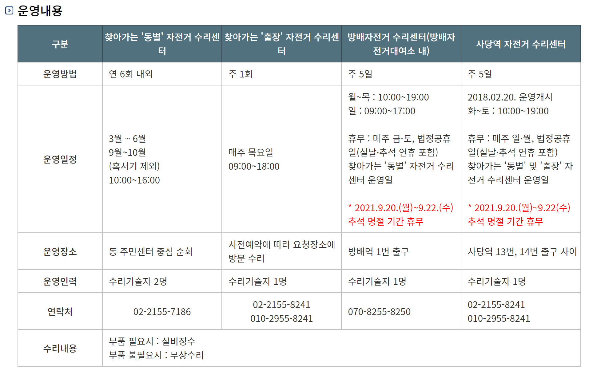 홈페이지에는 일요일 9시 부터 시작한다고 되어 있지만 수리는 10시 부터 가능합니다.