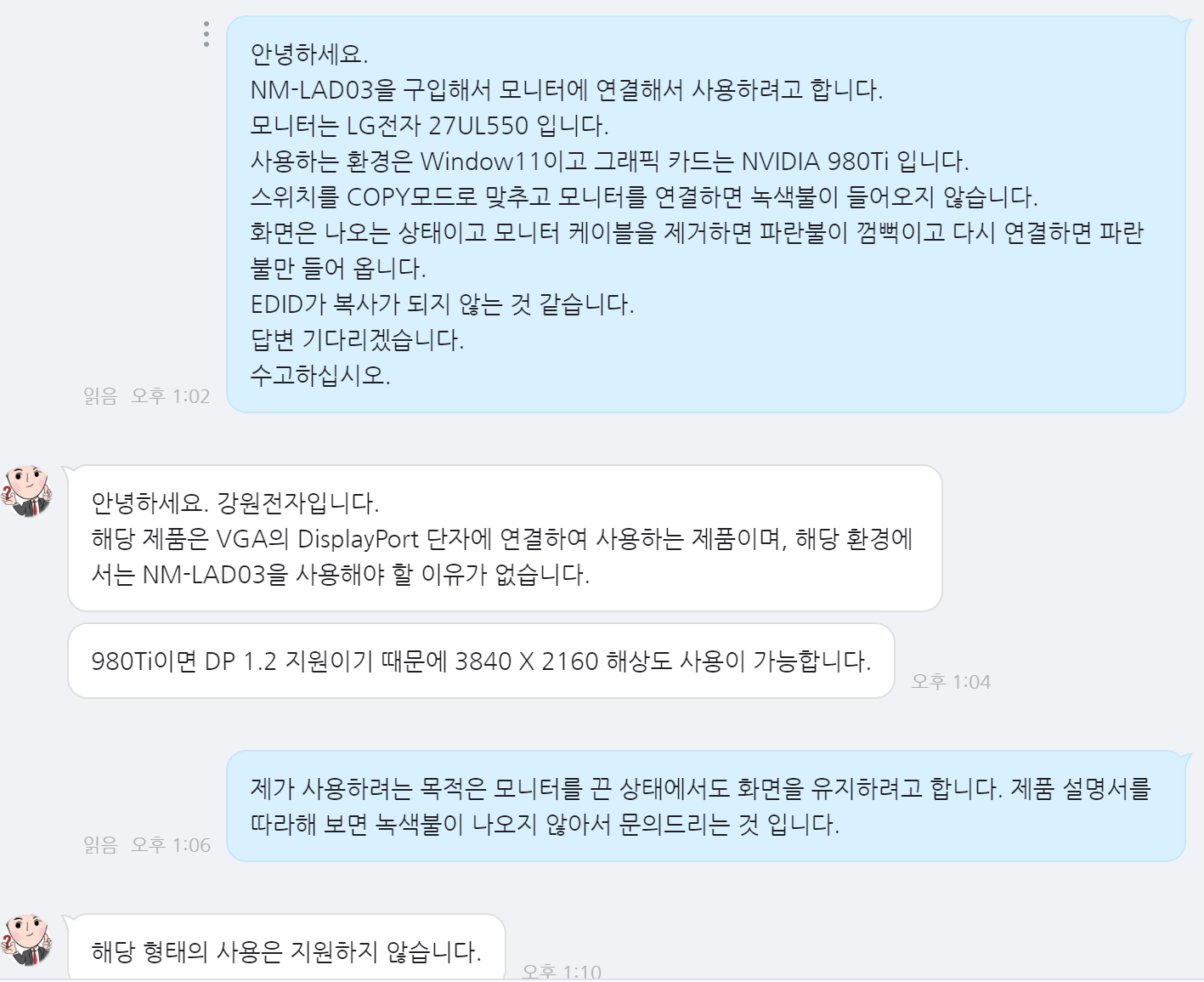 아래는 네이버 톡톡으로 문의한 화면을 캡쳐한 것 입니다.