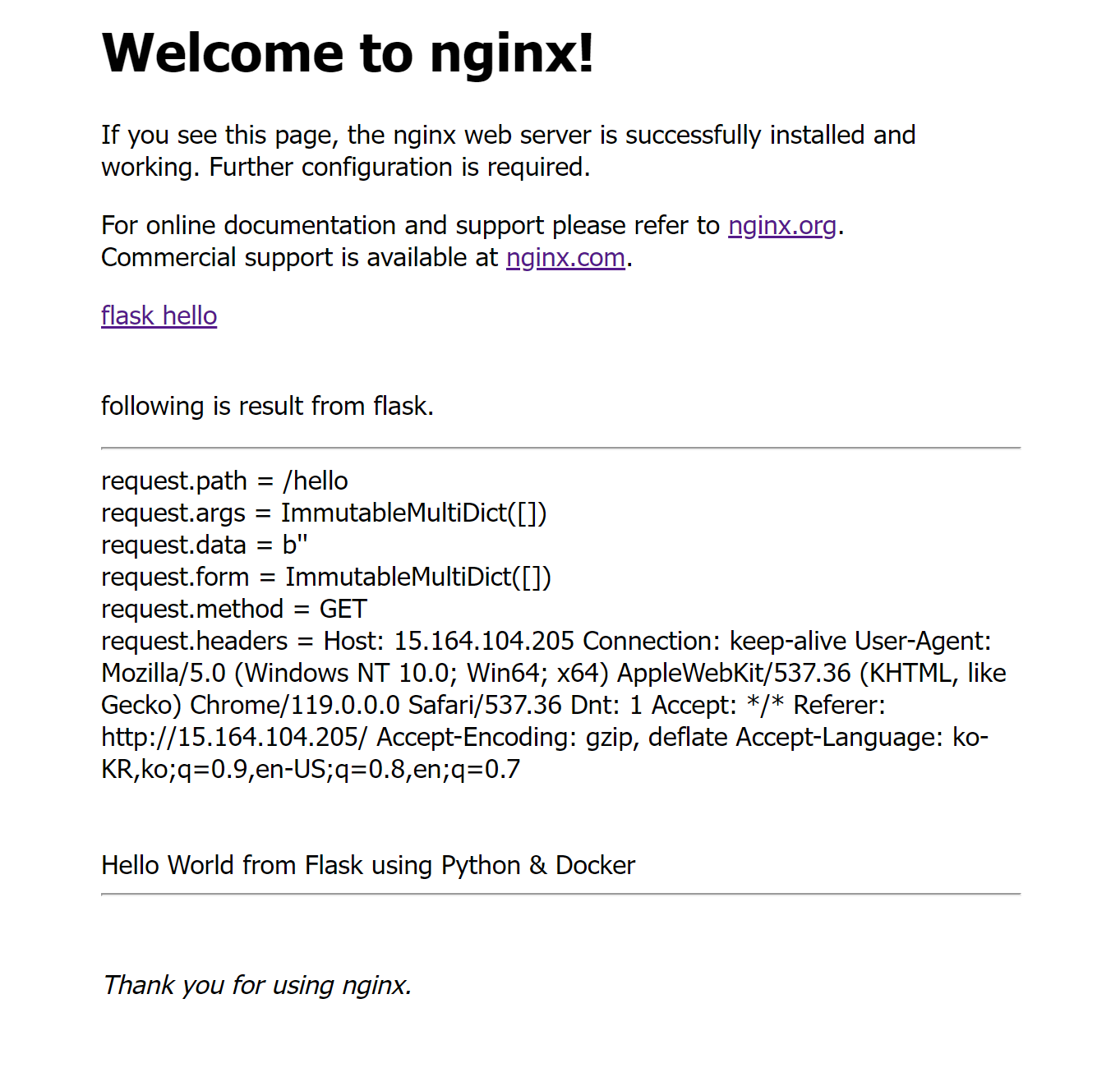 res += "<br><br>Hello World from Flask using Python & Docker"