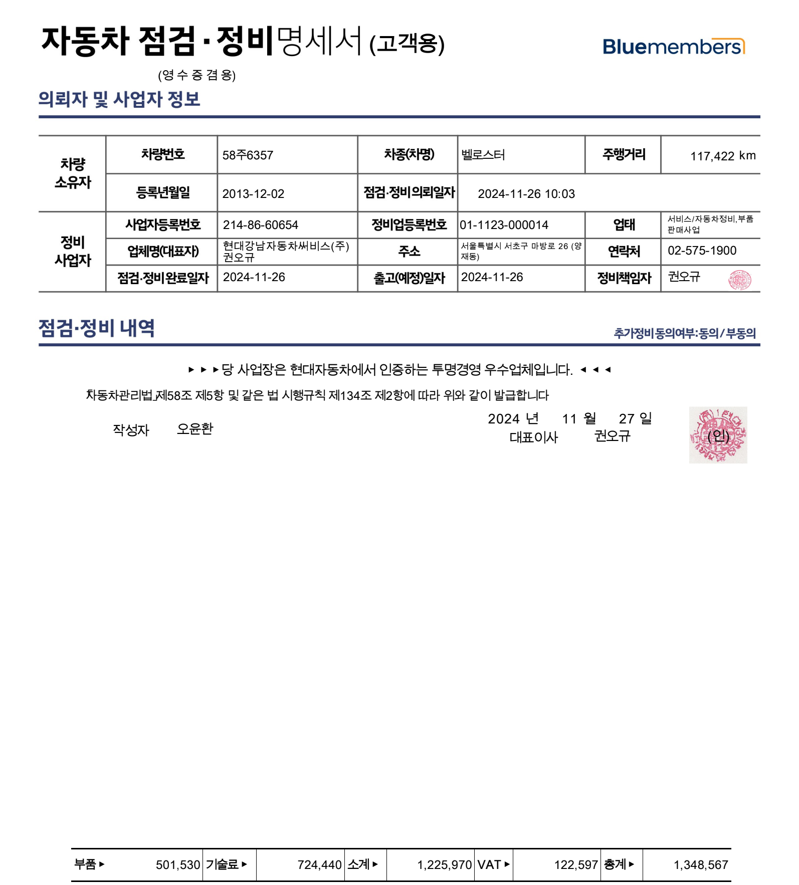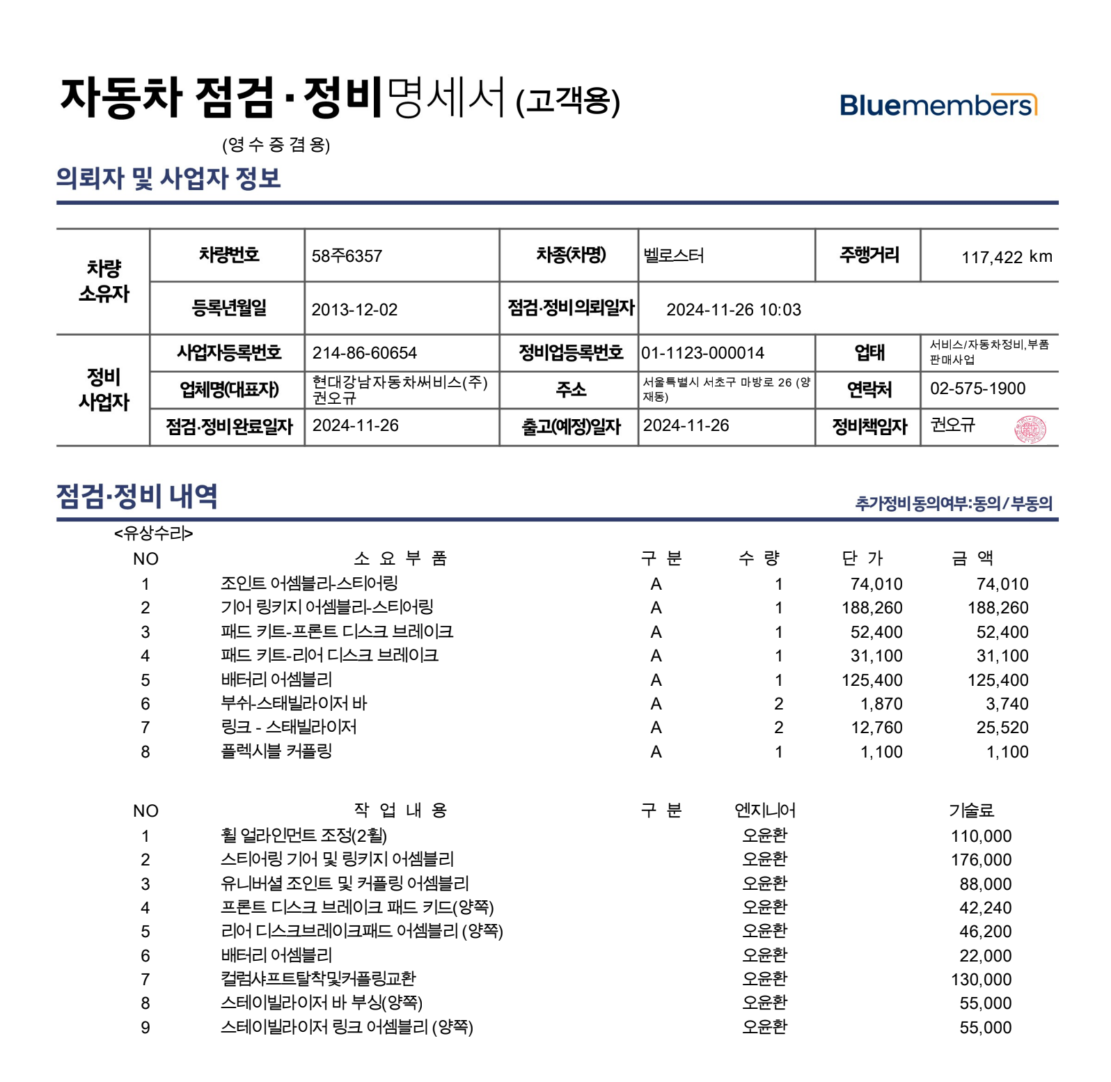 연식이 오래되서인지 수리비가 많이 나왔습니다.