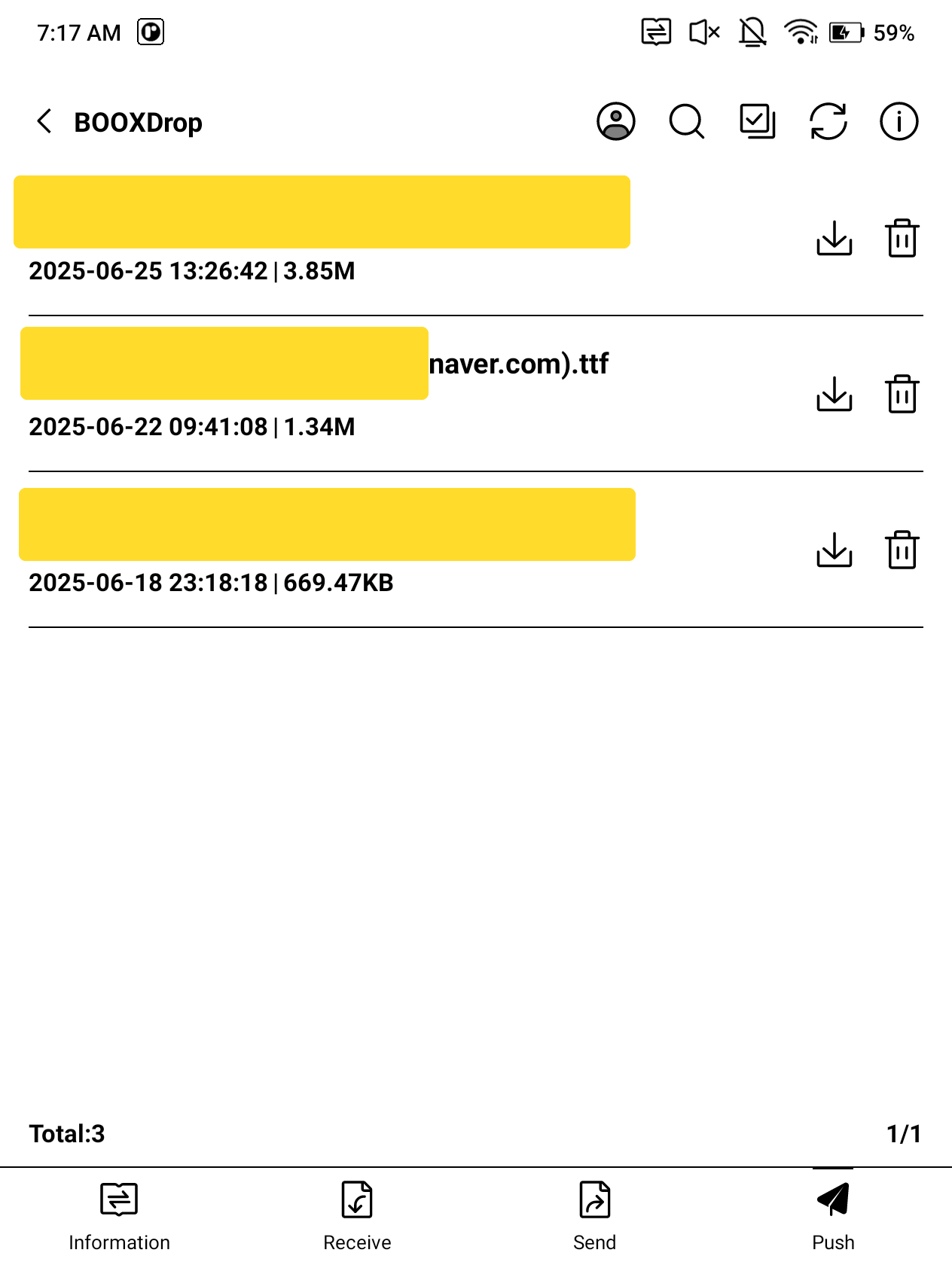 BooxDrop 메뉴를 선택하면 클라우드에 있는 파일이 표시 됩니다.